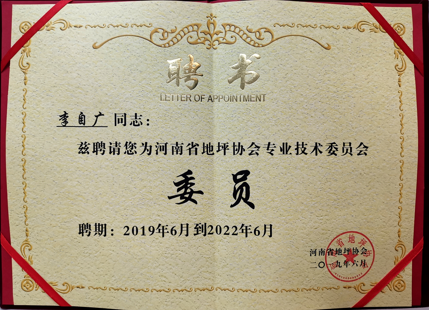 榮獲:河南省地坪協(xié)會**技術(shù)委員會:“委員”稱號